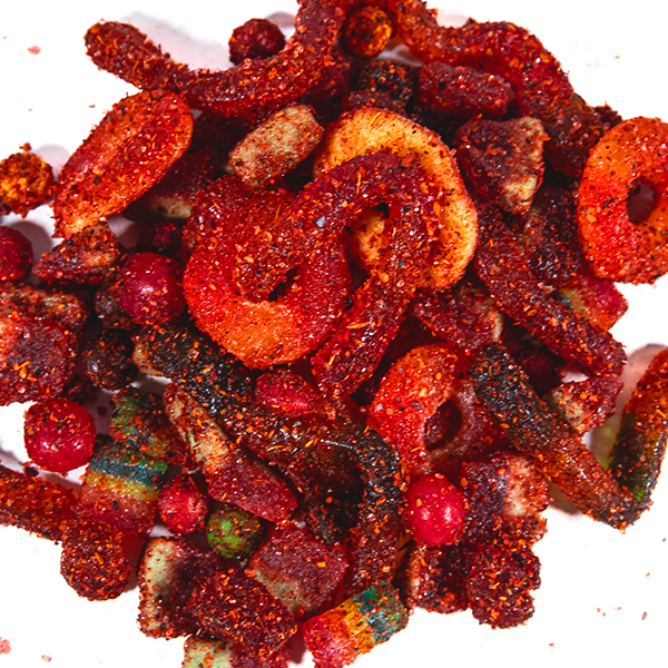 El mix endiablado incluye: Panditas, Lombrices, Aros de Durazno, Sandía, Xtreme Bites, Skittles y Cherry Sours.