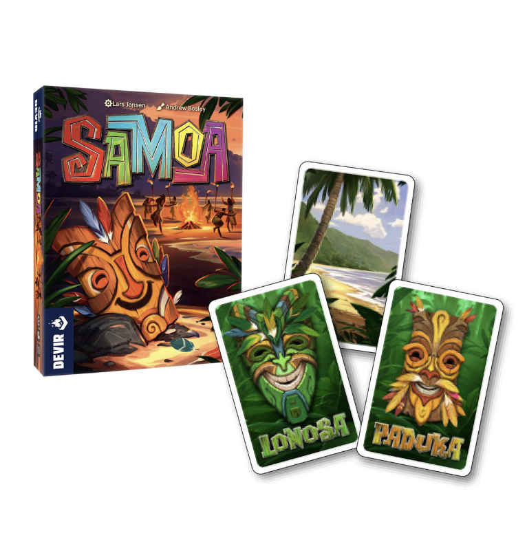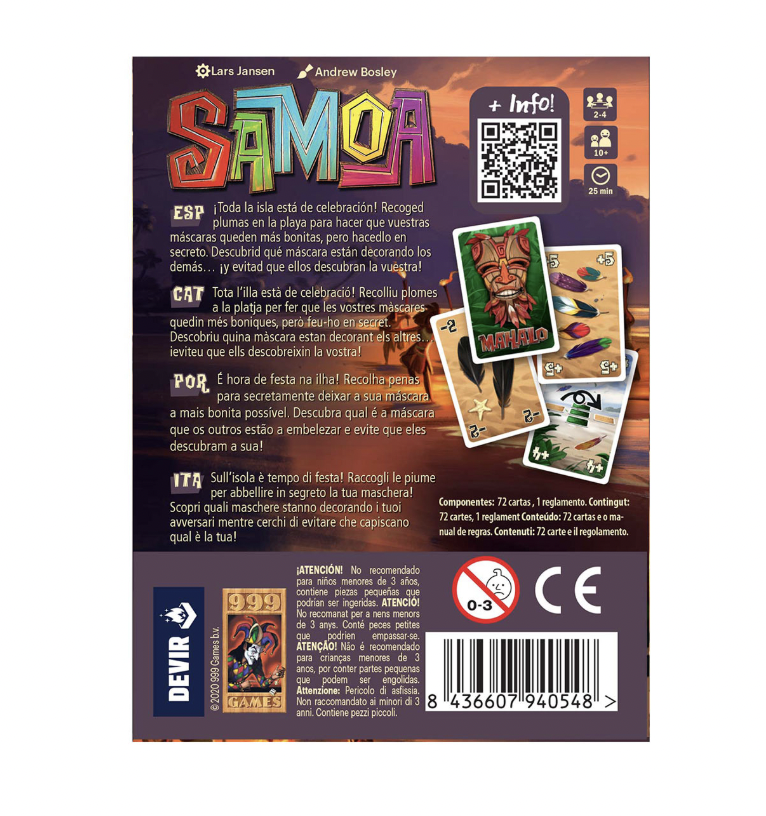 Hay una fiesta en la isla… ¡Y dura una semana entera! En la playa hay 5 máscaras de madera pintadas de colores vivos y os dedicáis a recoger plumas de colores en para decorarlas. Tenéis que hacer que queden preciosas, cuantas más plumas, mejor. Eso sí, las plumas negras traen mala suerte. A veces el viento se lleva una pluma, y otras veces alguna de las plumas se quema con las llamas de las hogueras. Tenéis que intentar por encima de todo que vuestra máscara favorita quede lo más bonita posible… pero nadie puede saber cuál es. ¿Sabéis qué máscara están decorando los demás? ¿Y lograréis evitar que los demás sepan cuál estáis decorando vosotros?